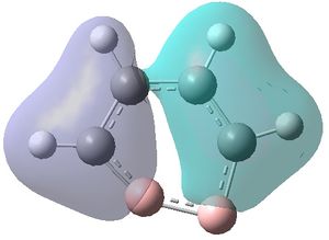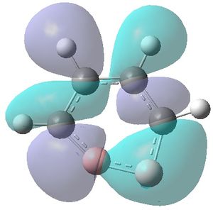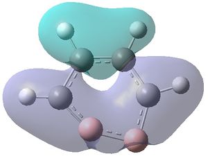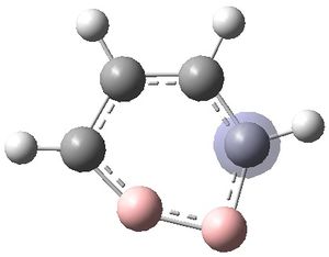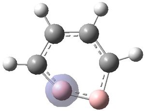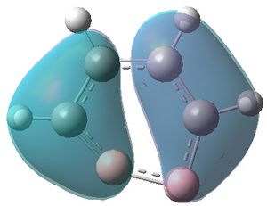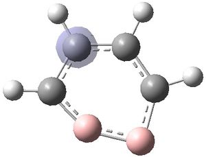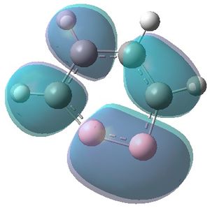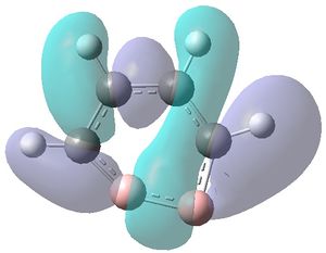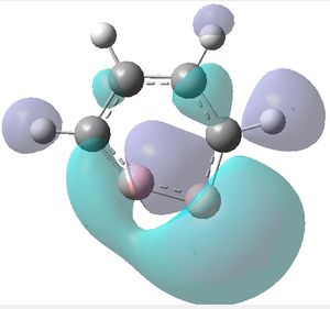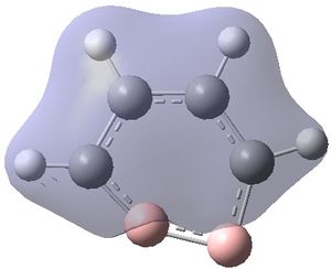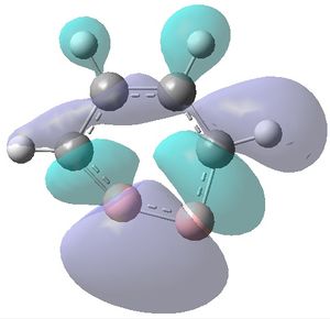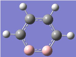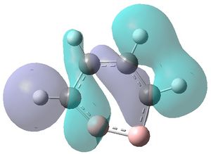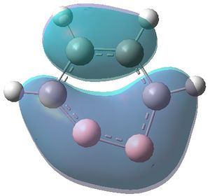 MO 17 may be roughly matched up to MO 4 for benzene, because two adjacent C atoms and two adjacent B atoms are the same phase, whereas the remaining two C atoms on the opposite sides of the ring to each other are a different phase. However, a very large difference between MO 17 and benzene's MO 4 lies in the fact that MO 17 does not have a node going along the plane of the ring, which suggests that this MO is formed from atomic s-orbitals instead of p-orbitals.