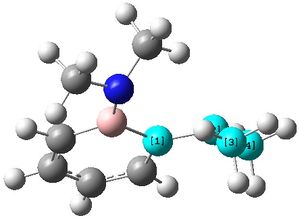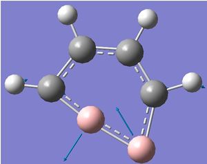 The C-B-B-C dihedral angle is seen to be 178.7 degrees, which is very close to 180 degrees. This suggests that the molecule (3) has gained aromaticity upon reduction from (2) because one of the definitions of aromaticity is planarity.