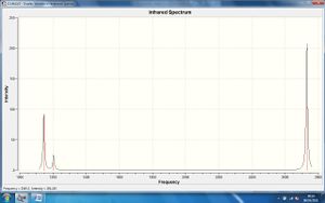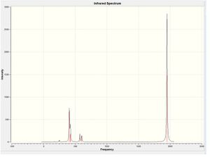 Although the molecule was expected to have 6 different vibrations, as predicted by the frequency calculation, it can be seen that the IR spectrum only shows three different peaks: at around 1140 cm-1, 1200cm-1 and 2750cm-1.