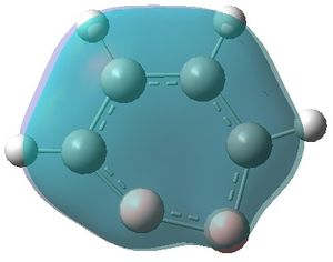 MO 16 begins to resemble the the predicted LCAO MO for benzene, shown below. MO 16 is seen to strongly resemble MO 1 for benzene, with one single node going along the plane of the ring.