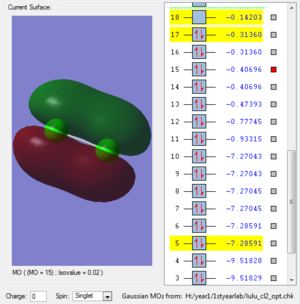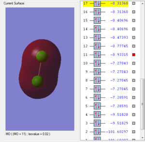 This molecular orbital is consisted of two 3s atomic orbitals from each chlorine atom. This orbital is occupied by two electrons. Two atomic orbitals are in the same phase. This orbital is symmetrical. The energy of 3s molecular orbital is the higher than the 2s molecular orbital and the size of the molecular orbital is bigger because electron in 3s orbital experiences larger degree of shielding so the attractive froce between the nucleus and the electrons is smaller, electrons are more diffused. The energy of 3d molecular orbital is higher make this bond more likely to break in the reaction. The energy of this molecular orbital is not the highest.