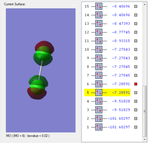 This molecular orbital is formed by two 3py atomic orbitals overlap horizontally with one another. A sigma bond is formed.Two 3p atomic orbitals are in different phase. The orbital is anti-bonding. There are two electrons in this molecular orbital. The structure is not symmetrical. This molecular orbital has higher energy so it is more likely to break in the reaction. It will break when 17th molecular orbital breaks.
