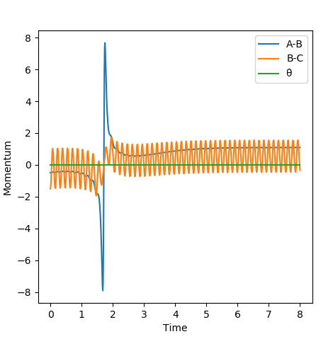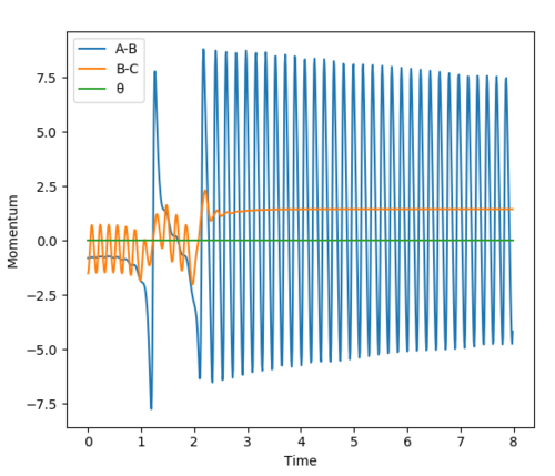 This table shows that just adding more energy to a reaction does not necessarily mean that the molecules will react. The momenta of the particles is important. Similarly, more momentum does not necessarily lead to a reaction as can can be seen from the case with p1= -2.5 and p2= -5.0. This is because the molecules need to have the right amount of energy to react and then move away from each other. If they have too much energy they could just dissociate and bounce off of each other like in p1=-2.4,p2=-5.0. Therefore, not only do the particles need enough energy/momentum to get over the transition state, they can't have too much or they can come back over the transition state to the reactants.