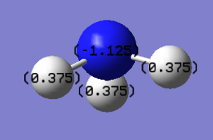 Nitrogen (N) is more electronegative and pulls electron density away from than Hydrogen (H) therefore the expected charge on Nitrogen will be negative and the one on Hydrogen positive. Since there are three H atoms present and the molecule is neutral, the charge on the Nitrogen will be three times the charge of each hydrogen atom