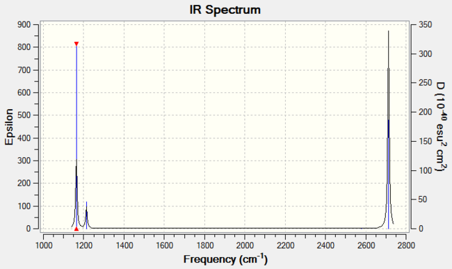 In this spectrum, there only appear to be three peaks, which seems to contradict the number of vibrational modes. However, one of these vibrational modes at 2590 cm-1 is not IR active. Therefore, 5 of the 6 modes would be expected to be IR active. Of these 5, there are also degenerate vibrational modes at 1214 and 2713 cm-1. The degeneracy means only 3 peaks are expected on the IR spectrum.