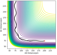 2. My best estimate of the transition state position is r1 = r2= 90.775 pm. The trajectory with this estimate and zero initial momentum has constant internuclear distances throughout the time. It doesn't "roll" towards the reactants or products proving that the trajectory is exactly at transition state.