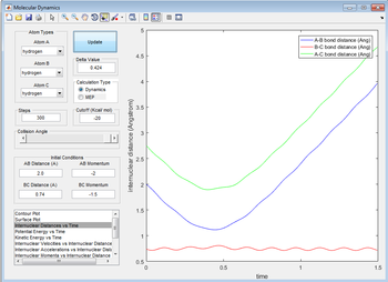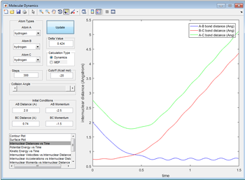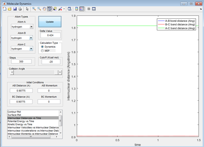0.90775 Å. In the animation section, when you change the distance from this by 0.00001 Å or 0.000001 Å the distance varies between 0.9077 and 0.9078 Å. In the image below it shows internuclear distance vs time plot in which the BC and AC distance have horizontal lines. Changing the distance AB and BC to 1 Å shows a sinusoidal curve instead of horizontal lines.