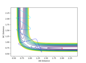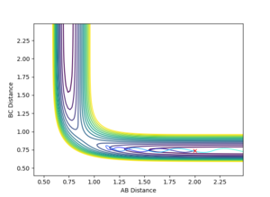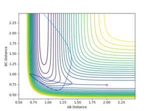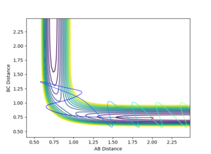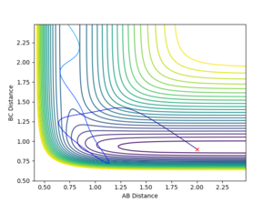 It can be seen from the Internuclear Distance vs Time graph that at 0.908 a.u for AB and AC there is no oscillation, which means we are on a point of 0 gradient on the potential energy surface, which is the TS saddle point.