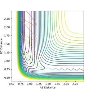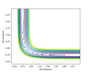The transition state for the FHH system was not as easy to locate as the symmetric HHH system. Hammond's Postulate was used to make a guess at the position, and using the Contour Plot the initial starting position was moved opposite to the movement of the reactants, until no movement was seen.