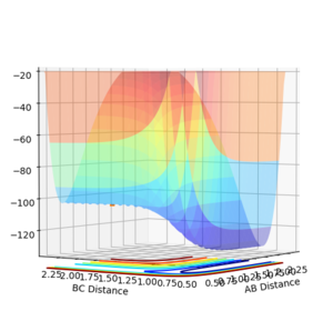 The Potential Energy surface of a system shows how the potential varies with distance in a 3D plot. Two points of interest are minima and transition states.