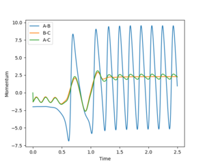 The Mechanism for this process can be deduced from the Momentum vs Time graph. It can be seen that the momentum of the initial vibration of the H2 molecule and the momentum of the H2 and F species moving towards each other is very small compared to the final vibration of the F-H molecule formed. From the surface plots of this reaction we know it is exothermic, and due to the law of conservation of energy, it is logical to say that the released energy was converted to vibrational energy in the F-H molecule.