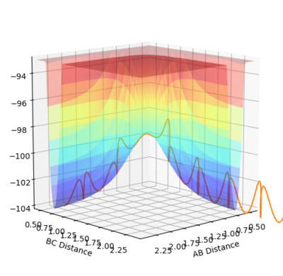 The transition state is the maximum energy on the minimum energy pathway, hence if a dynamic rolling ball is placed on the transition state with no momentum, it should stay still, i.e no changes in the kinetic or potential energy. After some number crunching, the transition state was found to be at (AB) H-H Distance = 0.744Å and (BC) H-F Distance at 1.811Å. The graphs above support this.