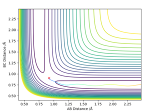 The transition state is defined as a saddle point where there is both a maximum and minimum depending upon the direction it is viewed from. At the transition state, the maximum and minimum will have differentials equal to zero. By taking the second partial derivative, we may then identify whether this point is a maximum or minimum. The potential energy surface diagram below illustrates how potential energy varies with interatomic distance between A, B and C. It may be seen that there is both a maximum and minimum as indicated by the curvature of the surface plot. Based on the surface plot, it may be observed that there is a greater curvature for points at the maximum in comparison to those at the minimum. This is due to the nature of the intrinsic chemical properties of the molecules in question.