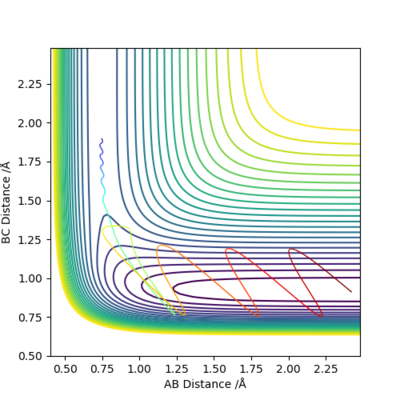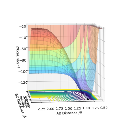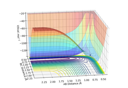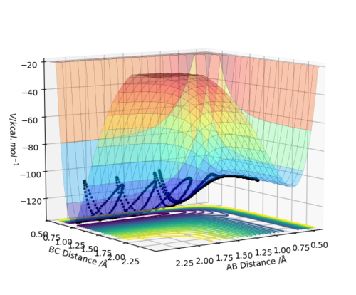 It can be seen that from the surface plot, from the reactant entry channel to product exit channel, the spot goes off a slope which means the reaction releases energy as heat in this process, hence it is exothermic. The distances between A-B and B-C are constant. Transition state: r1 = 0.745, r2 = 1.811.