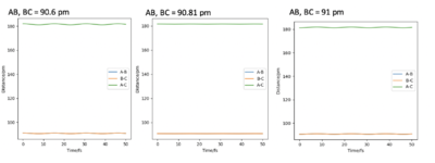 Figure 5 shows that as time increases, the distance remains stationary and does not change. This graph can only be seen with the initial conditions from table 2. Small deviations from these conditions leads to figure 6. Figure 6 shows that small changes in rts causes the graph to go from stationary to a repeating curve. This further suggests that 90.81 pm is a suitable estimate for rts.