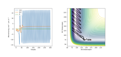 The black oscillating line in figure 3 represents the overall reaction pathway, a lot of oscillating suggests translational energy is being converted into kinetic energy. In this figure, the maximum potential energy is -434.47 V/kJ.mol-1.