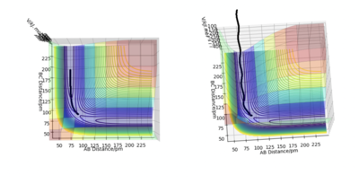 Figure 7 shows the location of the transition state from both a surface and contour plot. This plot shows that the transition state is located where both AB and BC equate to each other.