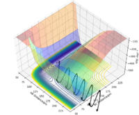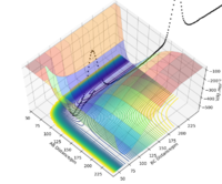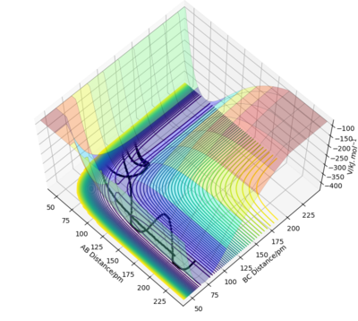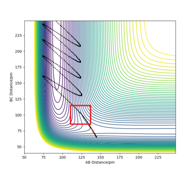 The minimum energy path (or mep) is a very special trajectory that corresponds to infinitely slow motion. This can be tested with initial conditions r1 = rts + 1 and r1 = rts, and p1 = p2 = 0.0 g.mol-1.pm.fs-1 and the calculation type as 'MEP'. With r1 set at 92 and r2 set at 91, it can be seen that the trajectory simply follows the valley floor to H1 + H2 - H3. Good, but refer to highlighted region on image in your description. Also why does the trajectory "follow the valley floor"? Sf3014 (talk) 12:37, 18 May 2020 (BST)