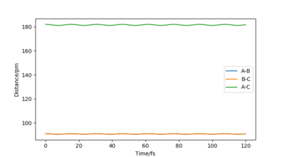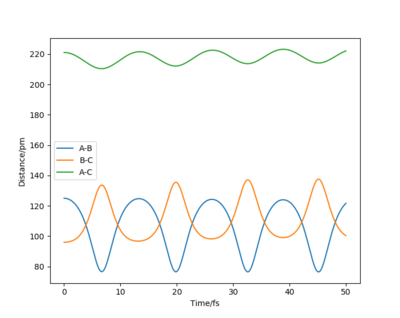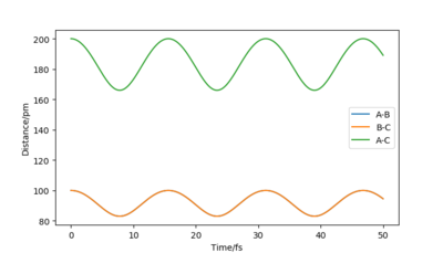 For example, the Internuclear Distances vs Time plot for r1 = r2 = 100 pm , p1 = p2 = 0.0 g.mol-1.pm.fs-1 is shown below ,and clear oscillation can be seen.