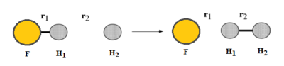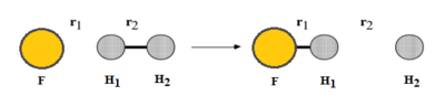 F + H2 is an exothermic reaction as characterised by the fact that the transition state occurs early in the reaction coordinate on its potential energy surface, i.e. it is an attractive surface.[3] This relates to the bond strengths involved as a relatively weak H-H bond is broken while a strong H-F bond is formed; bond making is an exothermic process, so the formation of a bond with high bond enthalpy makes the overall reaction exothermic.[3]