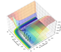 The transition state is defined as the maximum on the minimum energy path linking reactants and the products. The transition point can be identified on a potential energy surface as being at a saddle point, where the reactive trajectory is at its highest point and the gradient of the potential energy surface is zero. Saddle points have a local maximum in one direction and a local minimum in the other. They can be mathematically defined using their gradient: the partial derivative of the gradient, fx, equals zero, indicating that the gradient is zero at this point. Furthermore, saddle points are distinguished from local minima in that the result of the second partial derivative test, fxxfyy-fxy2, is larger than zero. [1]