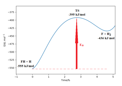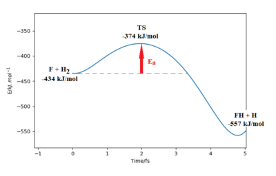 Part of the Energy vs Time plot is shown from the reaction, depicting the potential energy of the products, transition states and reactants. From this the activation energy can be calculated to be 59 kJ/mol for this reaction. note:the activation energy is a bit too high Sf3014 (talk) 21:45, 18 May 2020 (BST)