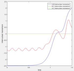 A new calculation was carried out with the initial distances equal to the final distances oberved in the previous calculation (r1 and r2 equalling 0.73Å and 4.6Å respectively, and the inital momenta equalling the final momentum values with their signs reversed, -1.24kgms-1 and -2.5kgms-1 respectively.