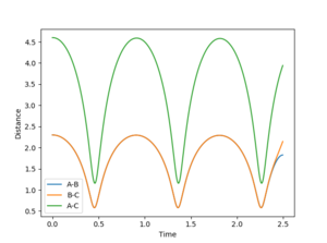 When the internuclear distance ranges from 0.74 to 2.3, the animation displays a periodic symmetric vibration initially followed by the break-off of atom C and the increase of distance between atoms B and C.