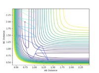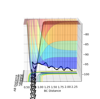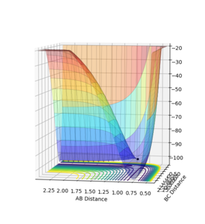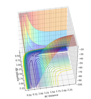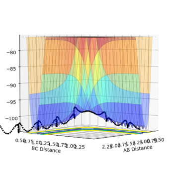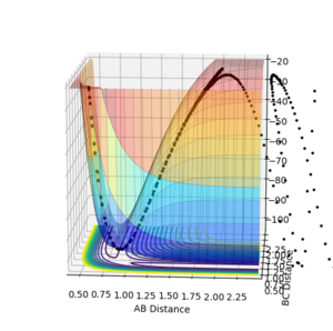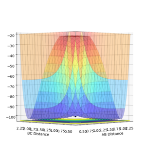The surface plot, Fig 2, illustrates the potential energy curve of the product: when the dBC is at its lowest and dAB is at its highest, the point corresponds to the product HBHC. The minimum energy path leading to the product is also clearly shown.