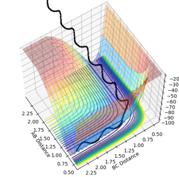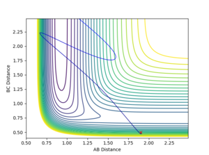 The internuclear distance plot illustrates the periodic oscillation of the atoms in the system. The atoms are far apart from each other initially then the attractive forces draw them moving towards each other causing the internuclear distances to decrease. When the atoms repel each other, they move away again leading to the increase of the internuclear distances. The periodicity suggests that the system lacks sufficient energy needed to overcome the activation barrier. That's not quite true. The activation energy is the energy difference between your TS to the reactants. The energy of your system is already higher than that. --Sw2711 (talk) 17:13, 31 May 2018 (BST) Therefore, the trajectory goes back down and the atoms A and C return to their original positions. This corresponds to the initial conditions where both the momentum values are set to zero. However, this also suggests that the transition state point has not been located yet. Based on the surface and contour plots, the transition state position should occur when the internuclear distance is between 0.75 and 1.0 Angstroms.