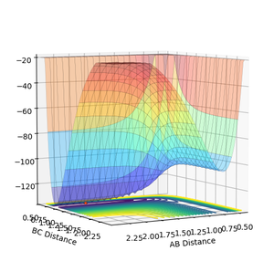 The potential surfaces of H-H + F and F-H + H are shown in the figures below. It can be seen they are simply reflections of each other. The reflection is caused as the coordinates(rAB & rBC) defining the H-H distance and the H-F distances are simply swapped between the two systems. In reality all that defines which of the above reactions is occurring is the initial seperation of the diatomic molecule.If the initial H-H distance is close to the H-H bond length (0.74 Angstrom), the H-H + F (exothermic) reaction is being investigated or if the H-F distance is close to the H-F bond length the H + H-F reaction is being investigated.