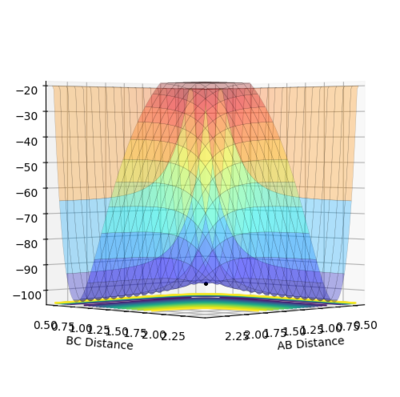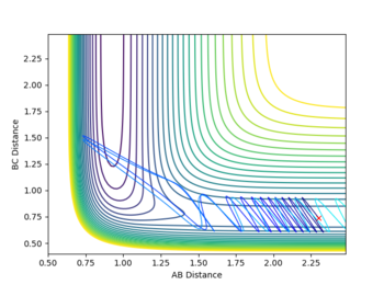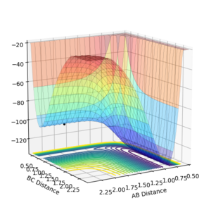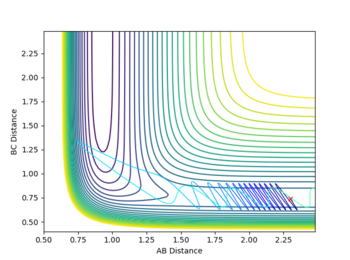 Running a calculation with the same initial conditions as the discussed MEP calculation, but as a dynamics simulation (i.e. where the speed and kinetic energy is allowed to vary naturally) gives a somewhat different path. Firstly, the trajectory reaches the edges of the contour plot in notably fewer time steps than the analogous MEP case; in this case the dynamics trajectory reached the edge of the surface at time step 578, whereas the MEP did not reach the edge even after 10,000 time steps. Secondly, there is a very noticeable oscillation along r2. This path can be interpreted similarly to the MEP case where a bond has formed in r2 and r1 continues to increase as the 3rd hydrogen atom moves away, the only difference is r2 no longer reaches a constant value, but instead oscillates about one.