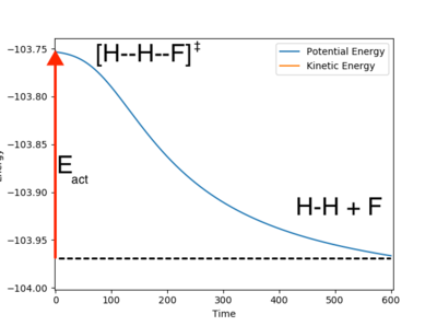Running the dynamics simulation with more time steps (1000 instead of 500) for a point starting at the transition state, it was found the system changed, decreasing the H-F distance a small amount. This implies that the transition state previously found was inexact and slightly underestimated the HF bond length of the true TS. The original rFH,ts was hence iterated on until the system no longer moved under 1000 steps, to obtain a value slightly accurate to the true TS of r'FH,ts=1.81022. This iteration is relatively insignificant, so the original value will used for the rest of this report.