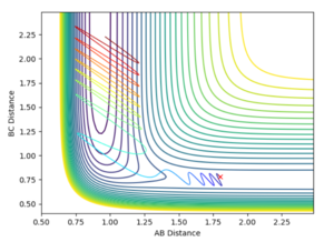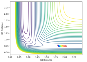By slight alteration of the equilibrium settings (AB being changed to 1.91 Å) we can force the reaction to one side. In this case, due to the extended bond length, towards the F + H2 side.