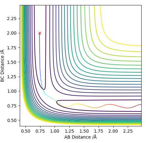 As the PES for this system will be symmetrical, we know the transition state geometry will lie on the line x = y (here AB = BC). Below I have started a trajectory on the point (2.3, 2.3) and we can see the system oscillates on the ridge and never falls off. It never leaves the ridge as there is no gradient at right angles to that ridge.