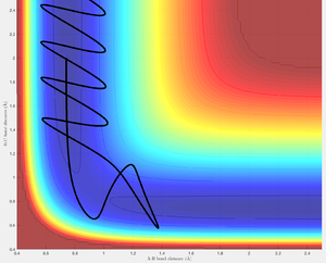 Both calculations produce trajectories that rolls from the reactants H1-H2 H3 in the direction of increasing r1 towards H1 H2-H3 (r1 = A-B) Upon energy minimisation the trajectory converges to the MEP [5]. The MEP calculation generates the minimum energy trajectory thus is restricted to only one degree of freedom, the interatomic positions r1 and r2. The exchange between kinetic and potential energy (due to vibrations) does not occur as a result of the minimisation, and so the generated trajectory does not have an oscillative nature - the kinetic energy is fixed at zero. On the contrary the dynamics calculation does not involve such limitations allowing it to have more degrees of freedom generating an oscillating trajectory, signifying influence of a non-zero kinetic energy.