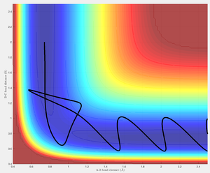 Increasing p2 from -2.0 to -2.5 provides the energy required to overcome the barrier thus allowing the reaction to proceed. The trajectory rolls from the reactants to the products passing through the transition structure at 0.893 Å. Again the vibrational energy of the HA-HB then HB-HC bonds are observed before and after passing through the transition structure respectively.