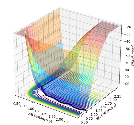 If one of the A-B or B-C distances is kept at the transition state distance while the other is changed slightly (e.g. 0.01 A), the system will have moved slightly from the transition state slightly, and will now move towards a state where the atoms with initial transition state internuclear distance will compose a molecule, while the initially incrementally larger distance will keep increasing to result in a free atom. Two different types of calculations can be run for this trajectory. In the first, the MEP trajectory, the momenta are reset to 0 after each step, so any vibrations that would arise from the initial conditions will not be shown, and the path taken will equal the minimum energy path. This equal energy path simply follows the bottom of the surface energy plot, resulting in a smooth line constantly moving downhill and never 'up' any of the contours.