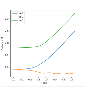 The second trajectory calculated is the dynamic trajectory, which shows a more realistic picture of what happens to the system moving from the transition state to the products. The line shows vibrations, with periodic variations in the BC internuclear distance. The observations above are confirmed by the internuclear distance plots.