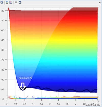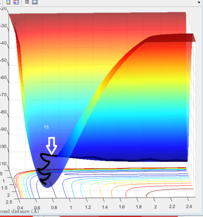 A set of initial conditions allow reaction to take place: r1(0) = 0.74 r2(0) = 2.30 and the momenta p1(0)=0 p2(0) = -2.7. From the potential energy vs time diagram we can observe the maximum point and minimum point on minimum energy path of reaction shown on figure 2 and 3. Both maximum and minimum has a gradient of 0(∂V(ri)/∂ri=0). The maximum refers to transition state is shown figure 3. Minimum and transition state can be distinguished using the second derivative. At the minima, the second derivative is not 0. At the TS, it is the maximum point of the bottom phase shown on figure3a but it is also a minimum point of potential energy which is a saddle point shown on figure3b with a 0 second order derivative.