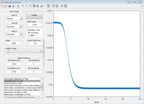 Matlab gives more detail about the momentum of two reactants and detailed positions which can help for further investigation. Here are 2 examples.