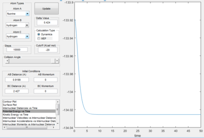 To determine the potential energy of the transition state, the potential energy against time graph was obtained at rHF (transition) = 1.79 Angstroms and rHH (transition) = 0.745. This was achieved by running a molecular dynamics calculation at 10 000 steps. The potential energy was determined to be -103.752 kcal/mol.