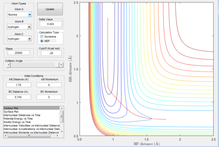 Following a similar procedure as given above, an initial mep calculation was performed at rHF (transition) = 1.82 Å and rHH (transition) = 0.740 with 35 000 steps, and the contour plot was obtained to observe the reaction trajectory. At the end terminal, the values of rHF (transition) and rHH (transition) are 2.029 Å and 0.7416 Å respectively.