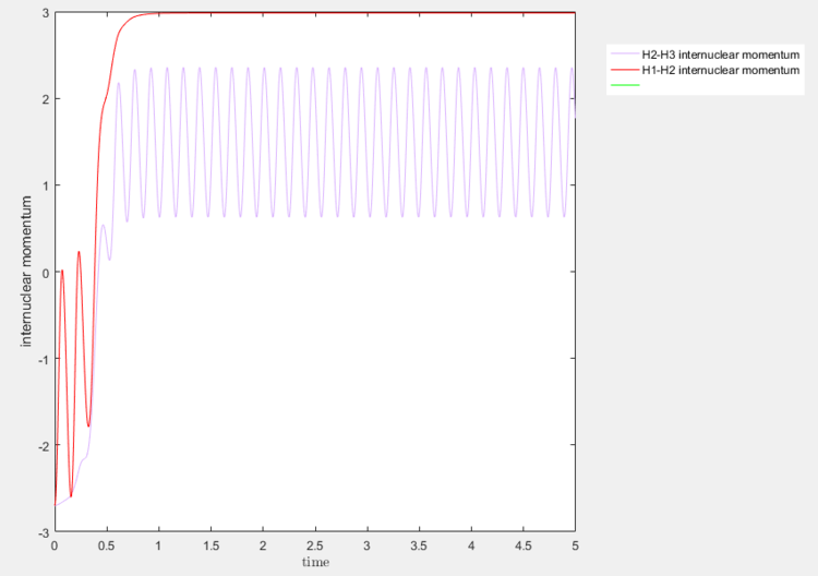 The sinusoidal pattern of the internuclear momentum for H1–H2 from t = 0 and t = 0.325, for instance, is indicative of molecular vibrations. This is corroborated by the sinusoidal pattern of the H1–H3 internuclear momentum curve after t = 0.695, after the formation of the H1–H3 bond. The highly symmetrical oscillatory nature of the graph is characteristic of symmetric molecular vibrations, and this is further corroborated by the plateau of the H1–H2 internuclear momentum at the same time, corresponding to an absence of vibrations between the now free H1 and H2 atoms.