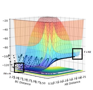 The reaction that leads to the production of FH + H is exothermic. Heat is liberated in the reaction. This means that the potential energy is converted to thermal energy, which is vibrational energy. The HF molecule, in fact, vibrates quite vigorously (it has a high momentum). This can be seen in Fig. X. The amplitude of the oscillations is, in fact, quite big. Calorimetry would be a good way of confirming the reaction[2].
