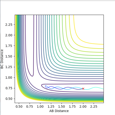 The rts can be estimated setting different values of r1=r2 and finding the distance that does not lead to the formation of a product (so the distance at which the system oscillates on the saddle point an infinite number of times). The first estimate is based on the H-H bond length in a H2 molecule, which is 0.74. Using this value in the program, it can be seen that it leads to the formation of a product. Therefore it has to be longer. Increasing it to 0.8, it can be seen that the molecule is still oscillating, although it oscillates at the saddle point. To have a transition state, the potential energy has to be constant, with no oscillations. Trying different values around 0.9, it was found that the minimum oscillation is at 0.907. The Internuclear Distances vs Time plot shows that the oscillations are very small and the distances A-B and B-C) coincide throughout the plot (Fig. 3 and 4).