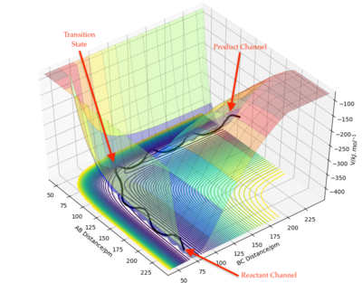These diagrams are useful in looking at the minimum energy pathway of a reaction. The top of both diagrams corresponds to the transition state, the point of highest energy. At this point, the gradient is equal to zero. The derivative of potential energy over reaction coordinate is known as Force, therefore at the transition energy, the Force is also zero. In a 3D setting like seen below, the transition energy is trickier to find.