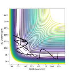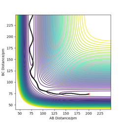 By looking at the contour plot, the reaction can be observed as exothermic. This can be seen as the transition state is found close to the reactant side. We can then try values 175 pm and 200 pm for length AB.
