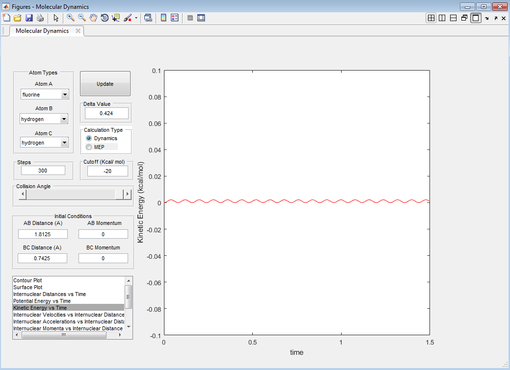The transition state was found to be a system with an H-H bond length of 0.743 Å and an H-F bond length of 1.813 Å. It has a minimum kinetic energy (close to 0) given in Figure 12 and is represented as a point on the potential energy surface.
