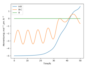 The final distance and momentum values can be found from these plots (using the 'get last geometry' tool) and a calculation can be set up where the initial positions correspond to the final positions of the trajectory above. And when momenta values signs are reversed. By reversing the momenta the reaction now occurs as the molecules collide with enough energy to reach activation. When both signs are positive (first row) no reaction occurs as the molecules move in opposite directions.